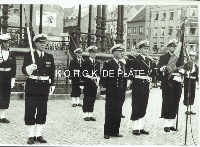 Vergroting. - Formaat : 28 x 40 cm. - Het Wapenplein. Eedaflegging op het vaandel van de Zeemacht door prins Albert als vaandrig-ter-zee 2e klas. Naast de prins Commodore Timmermans. Achter de prins, vaandrig-ter-zee 2e…