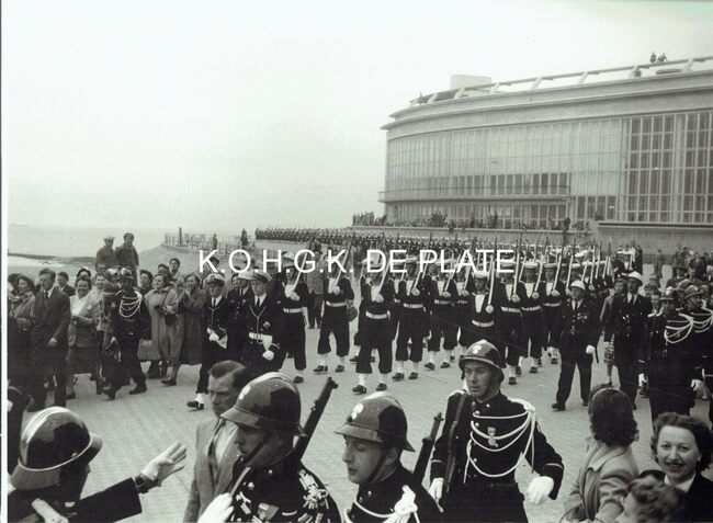 Vergroting. - Formaat : 28 x 40 cm. - De harmonie van de Gidsen (?) komt voorbij de eretribune en de garnaalmijn tijdens het defilé van 21-07-1966 op de Visserskaai.