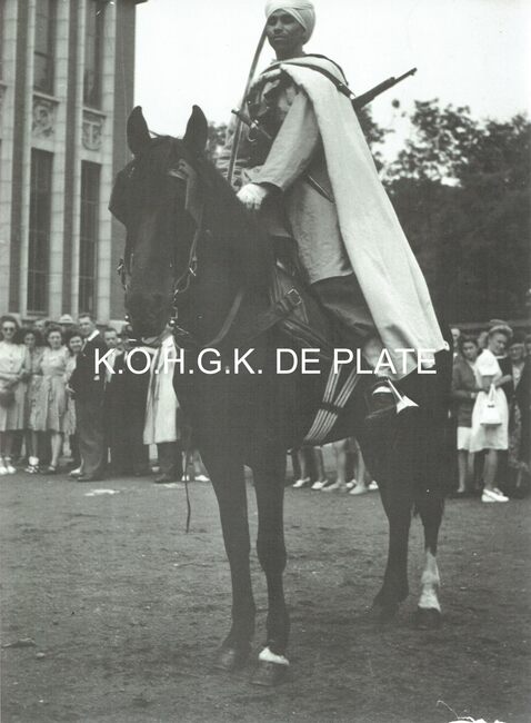 Vergroting. - Formaat : 28 x 40 cm. - Een Spahi ruiter op het Candaplein voor het stadhuis (de Spahis waren Noord Afrikaanse ruiters in dienst van het Frans leger).