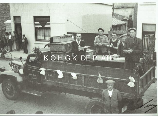 Vergroting. - Formaat : 28 x 40 cm. - De Steense duivenmelkers op een vrachtwagen van Gaston Diet in de inhuldigingstoet voor de nieuwe pastoor.