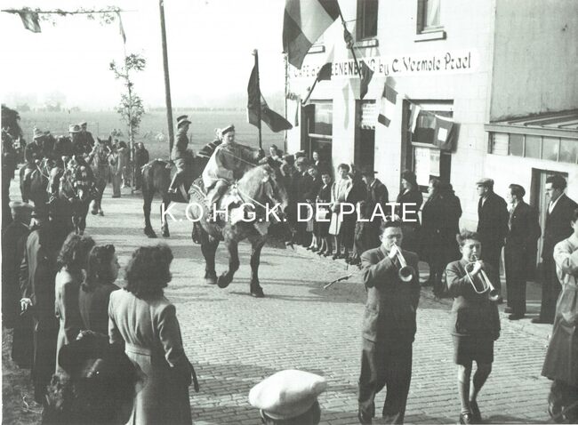 Vergroting. - Formaat : 30 x 40 cm. - De stoet komt voorbij café "Steenen Brug" van C. Vermote-Praet aan de Steensedijk.