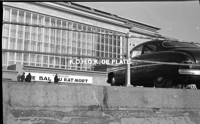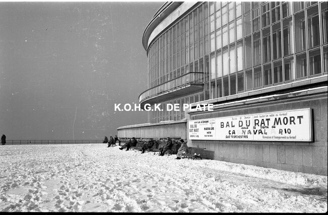 Negatief : 6 x 9 cm. - Met reclamepaneel voor het bal aan "Petit Nice", in de sneeuw
