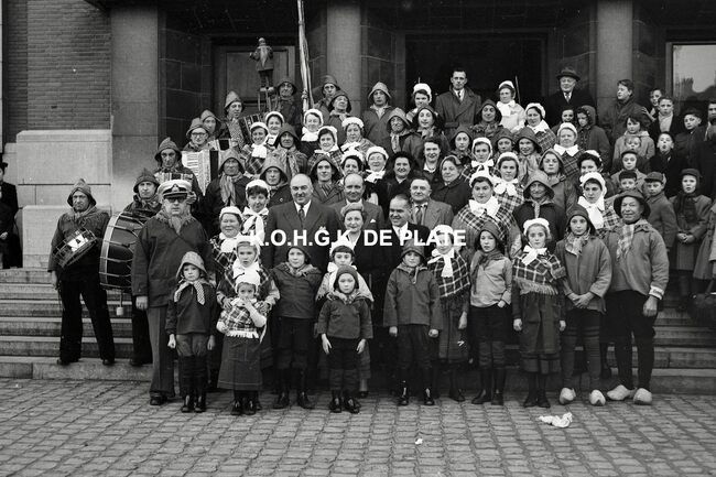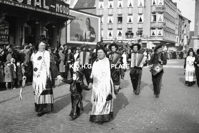 Formaat : 12,5 x 19 cm. - De folkloregroep van de supportersclub KVGO West op het Wapenplein nabij de Royal Nord Negatief :Formaat : 4 x 6,5 cm. - FOTOARCHIEF 202 FOTO LUC 0 DOOS 6 ROL 12