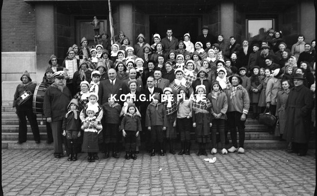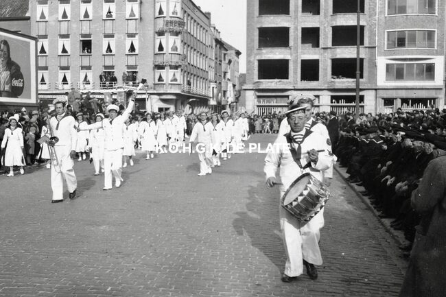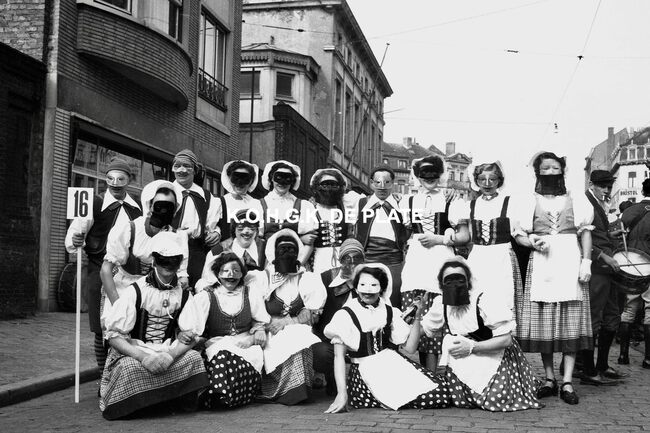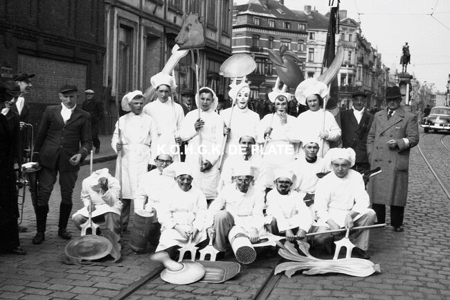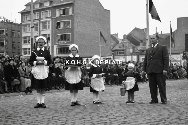 Negatief : 4 x 6,5 cm. - De folkloregroep de "Matroosjes" uit Bredene, hier op het Wapenplein. De groep bestond uit leden van de spaarmaatschappij "Concordia"