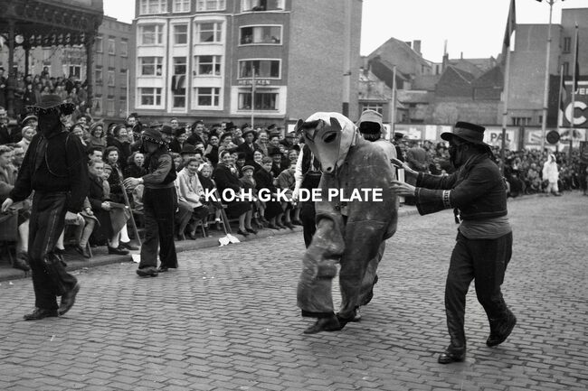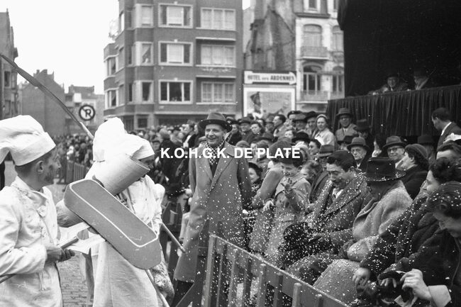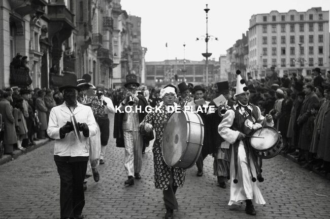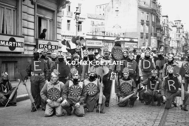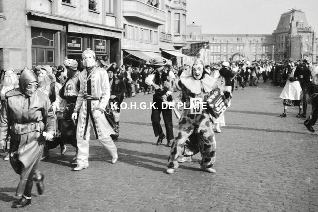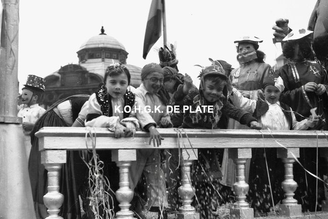 Formaat : 12,5 x 19 cm. - Carnavalgroep nr. 26 in de Van Iseghemlaan op de hoek met de Koningsstraat. Op de achtergrond, garage Ocean Negatief : Formaat :4 x 6,5 cm. - FOTOARCHIEF 202 FOTO LUC 0 DOOS 9 ROL 9