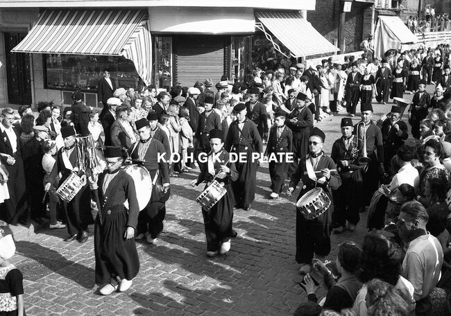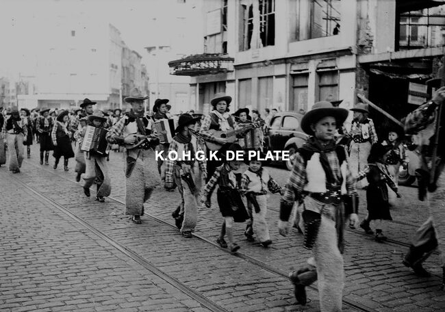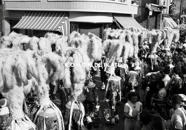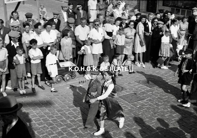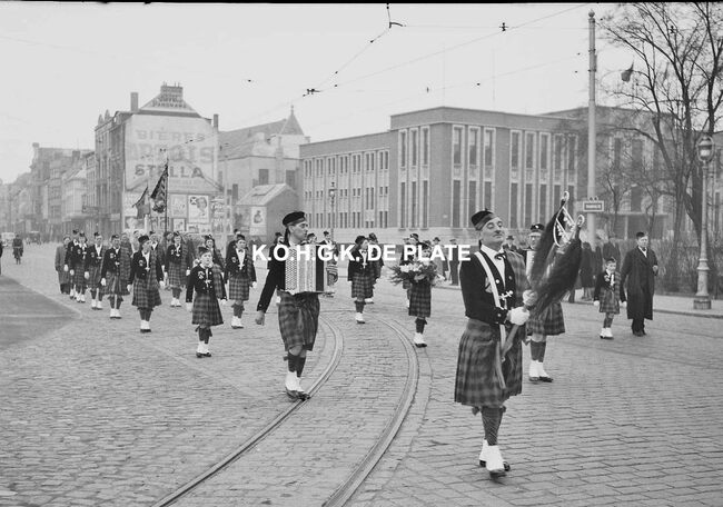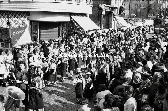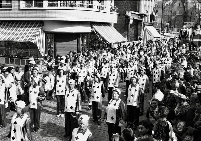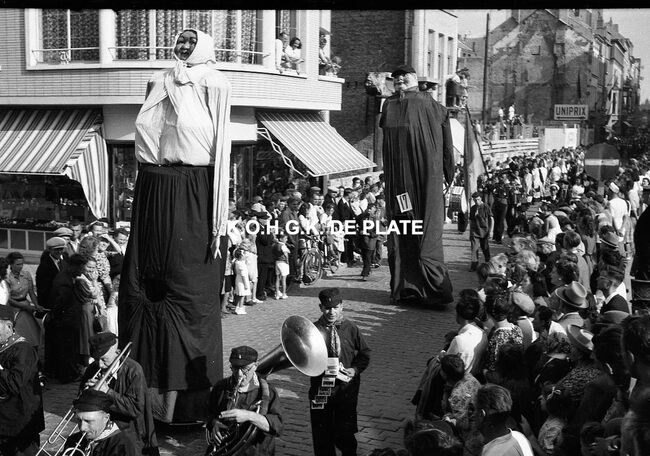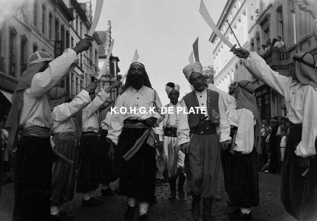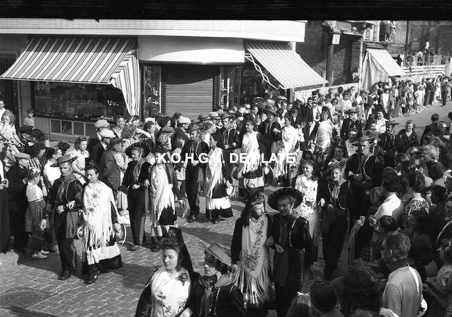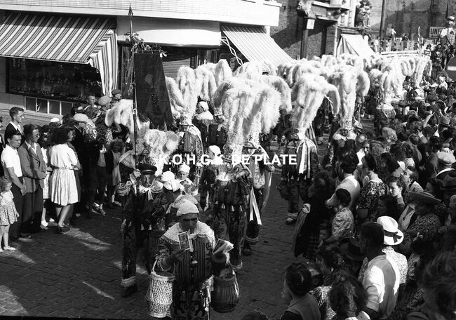 Negatief : 4 x 6,5 cm. - De groep "Les Gilles du Pays Noir" uit Charleroi in de Kapellestraat, hoek Ooststraat