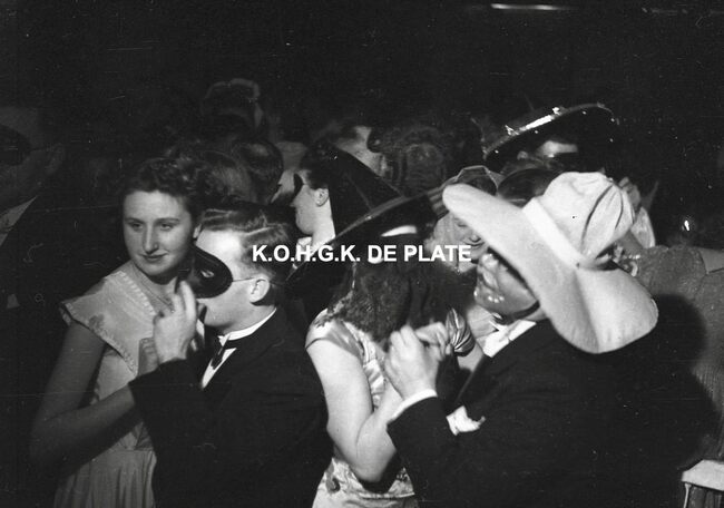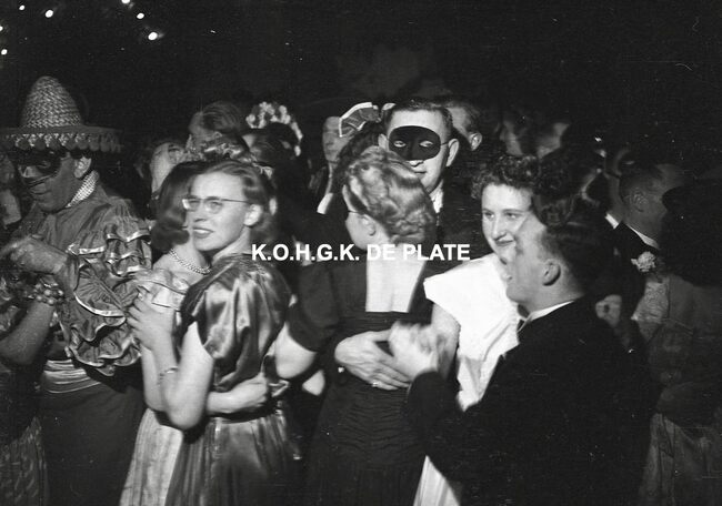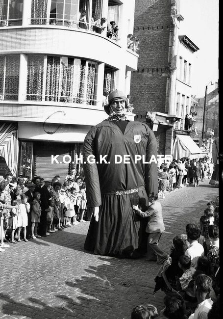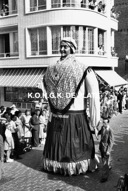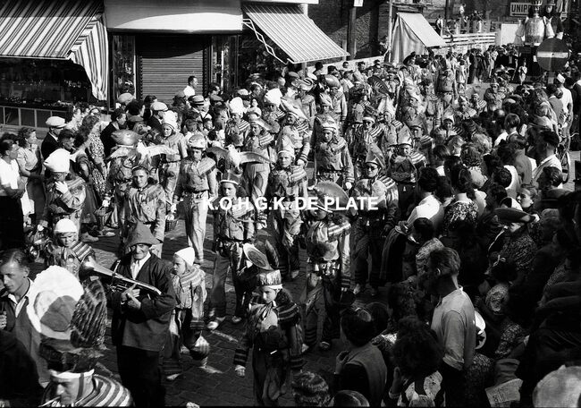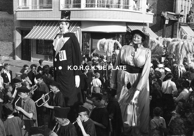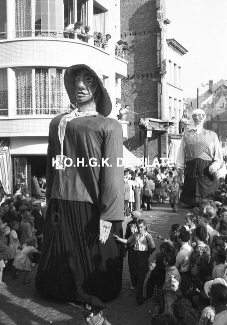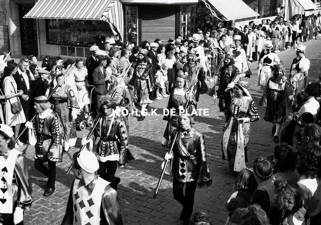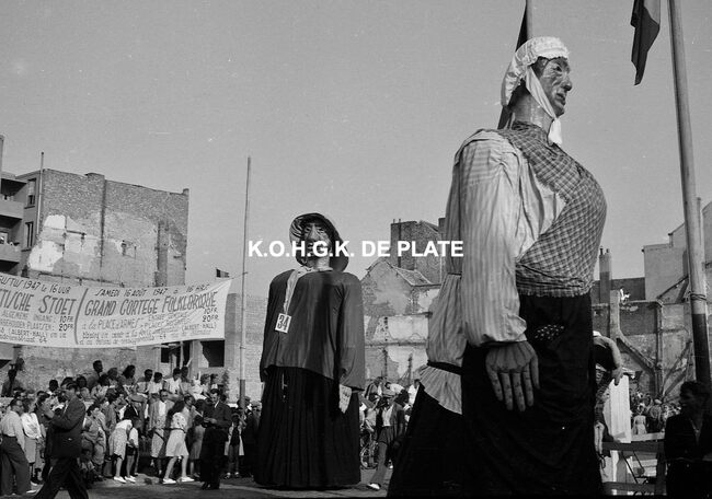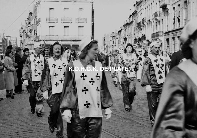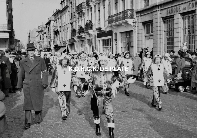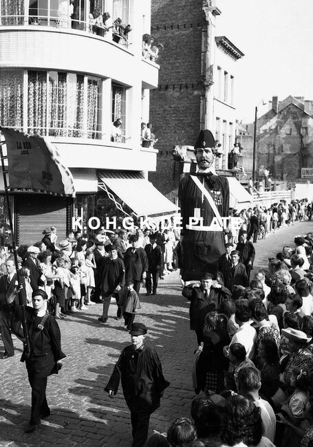 Negatief : 4 x 6,5 cm. - De groep "Les Gilles du Pays Noir" uit Charleroi in de Kapellestraat, hoek Ooststraat
