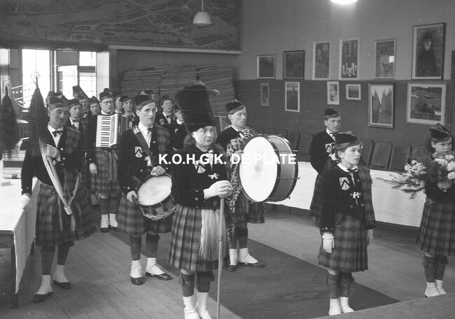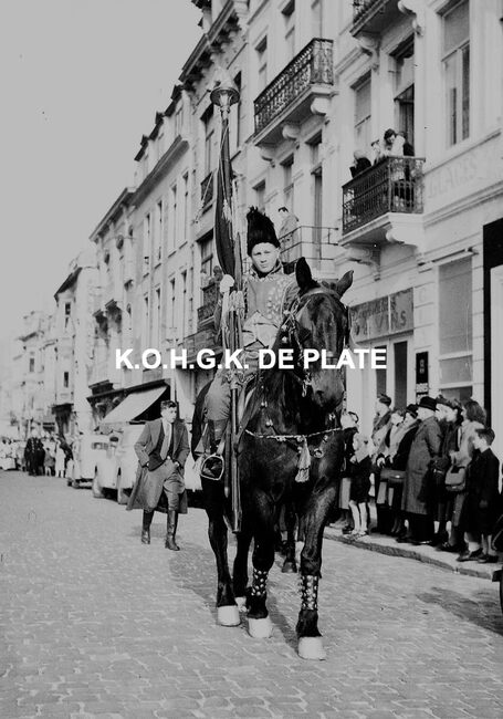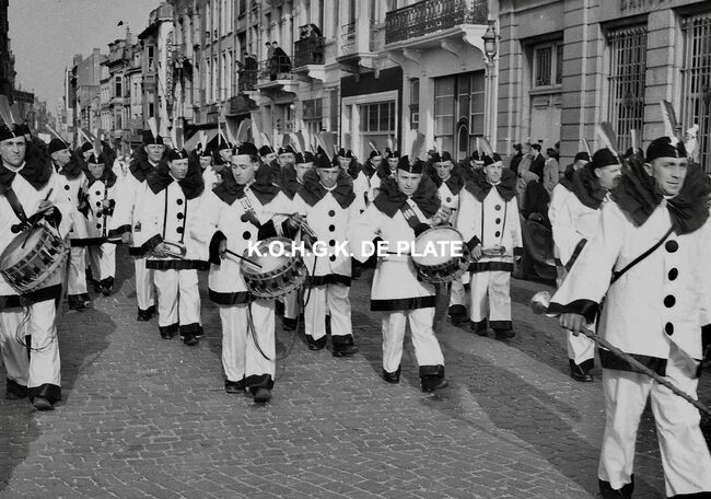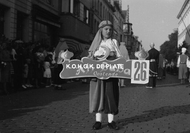 Negatief : 4 x 6,5 cm. - De Oostendse groep "Gilles der Zee" ind e Kapellestraat, hoek Ooststraat