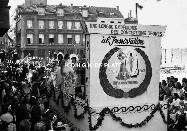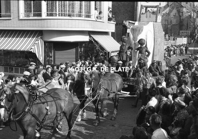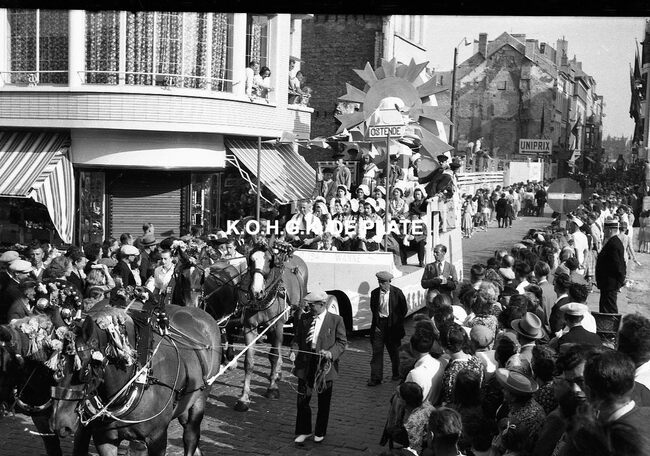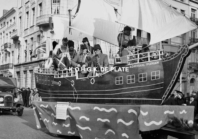 Negatief : 4 x 6,5 cm. - De praalwagen admiraalschip "Popham" bemand door leden van de "Koninklijke Maatschappij de Vereenigde Karabijnschutters" uit Bredene