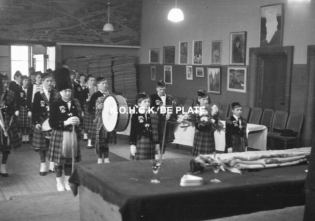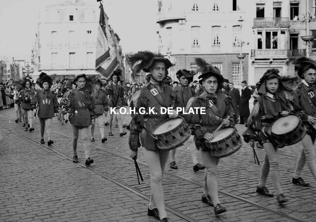 Negatief : 4 x 6,5 cm. - Inhuldiging van het vaandel van de Whistmaatschappij "Ostendia". Hier op het Canadaplein op weg naar de plechtigheid in het dienstdoend stadhuis (gerechtshof). Op de achtergrond, de…