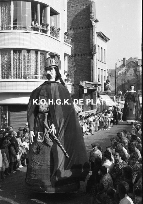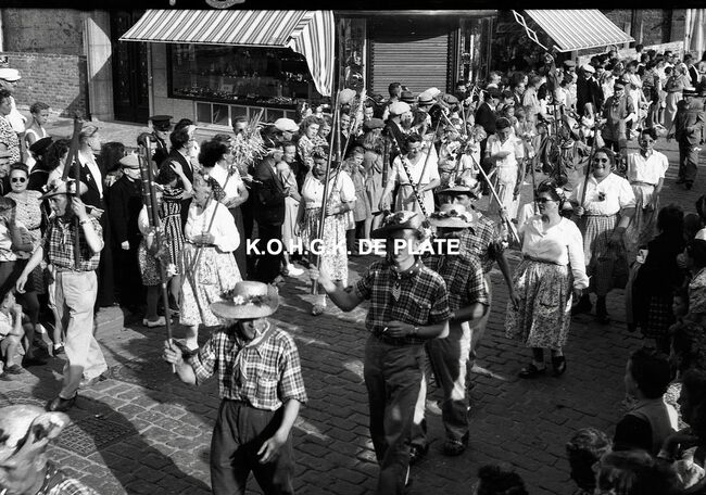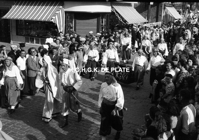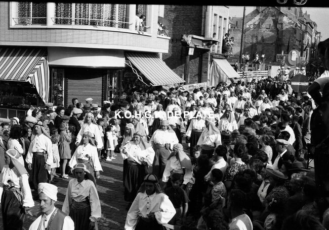 Negatief : 4 x 6,5 cm. - De leden van de folkloregroep "Het Huwelijk van Paul en Louise" van de spaarmaatschappij "Ons Vermaak" uit het café "Fientje Keters" uit Bredene, hier op de…