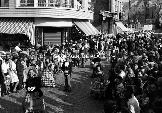 Negatief : 4 x 6,5 cm. - De folkloregroep "Het Huwelijk van Paul en Louise" uit Bredene, hier op het Wapenplein