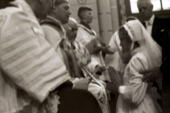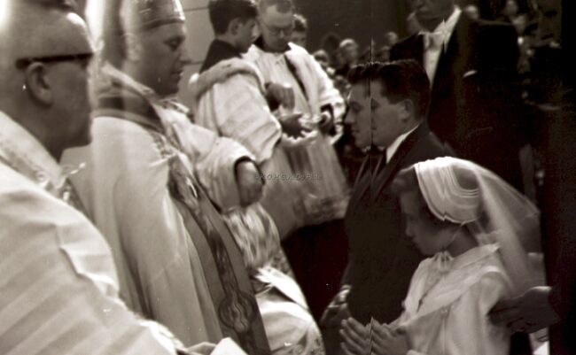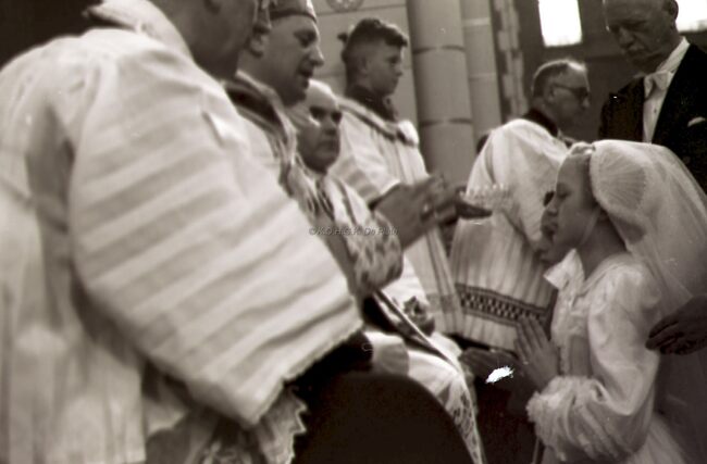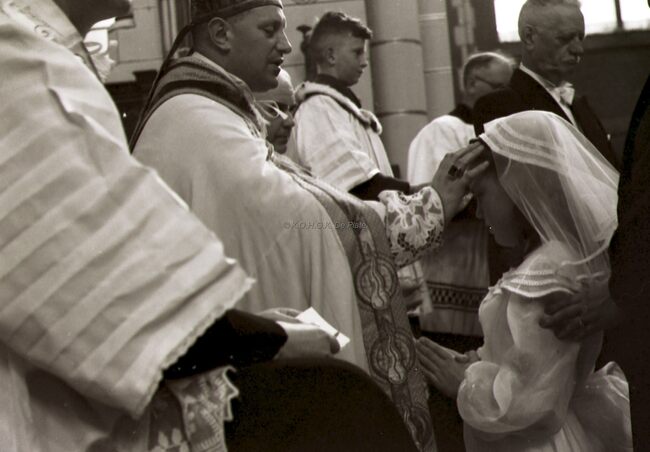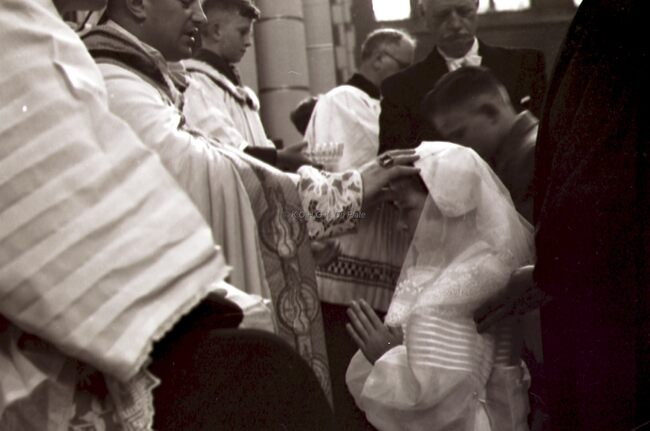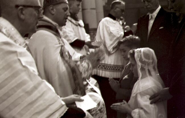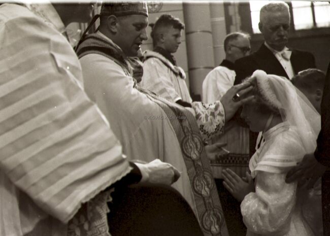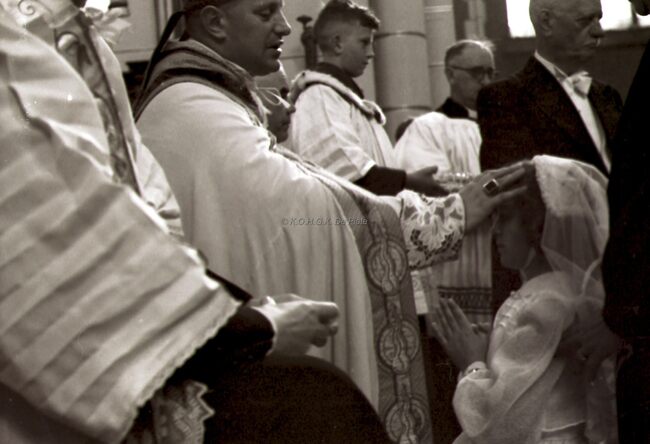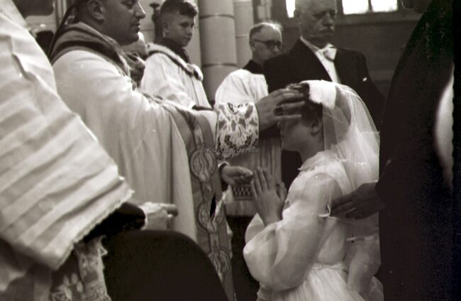 Een meisje wordt gevormd in de Sint Jozefskerk door de bisschop van Brugge Emiel DE SMEDT.