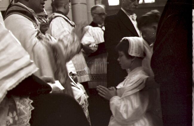 Vorming van een meisje op haar plechtige communiedag in de Sint Jozefskerk.