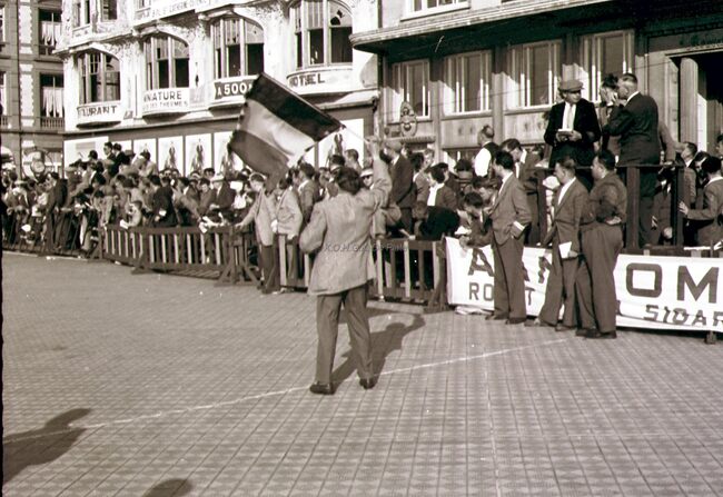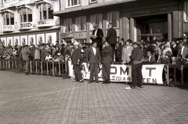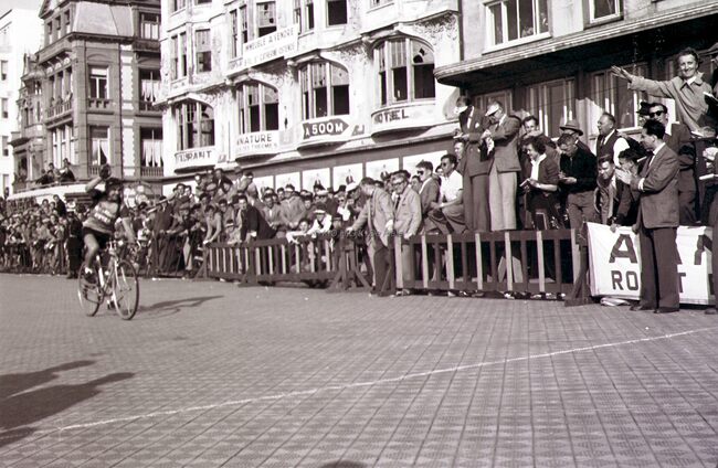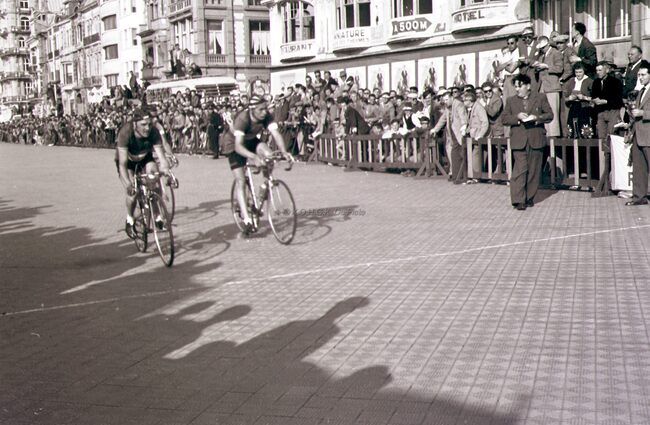 De winnaar van de 3e Grote Prijs der Kursaal 195 ,Omer BRAEKEVELT, gaat de eindstreep overschrijden op de Albert I-promenade. Twee aankomstrechters, met zonneklep, noteren tijd en plaats.