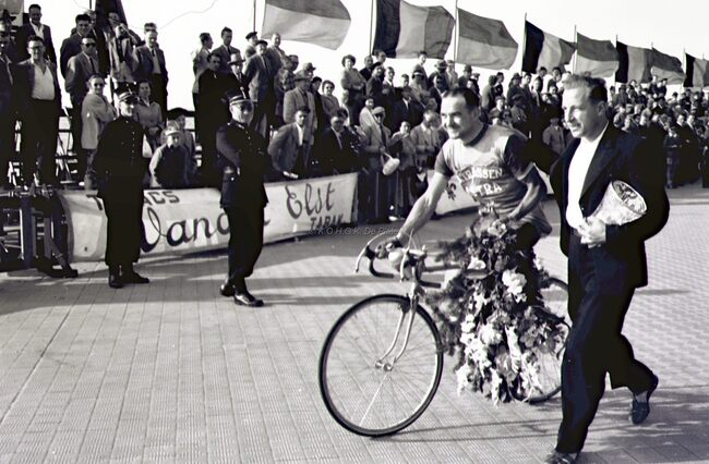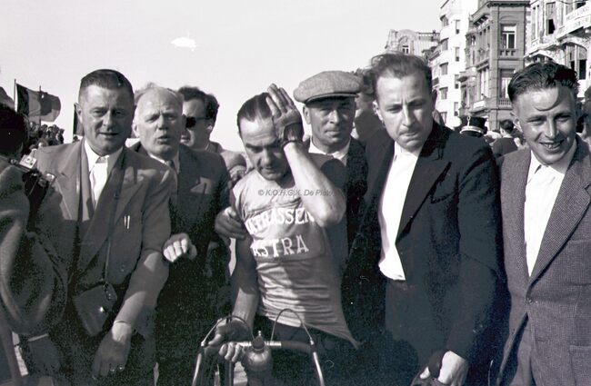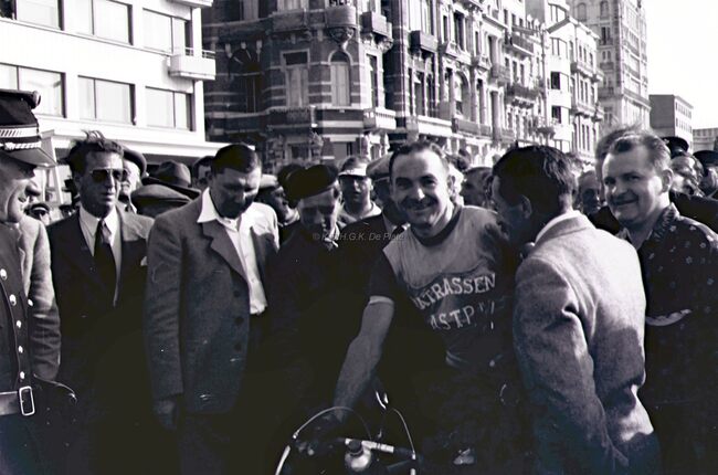 De winnaar, Omer BRAEKEVELT, van de 3e Grote Prijs der Kursaal 1954, na zijn zege op de Albert I-promenade.