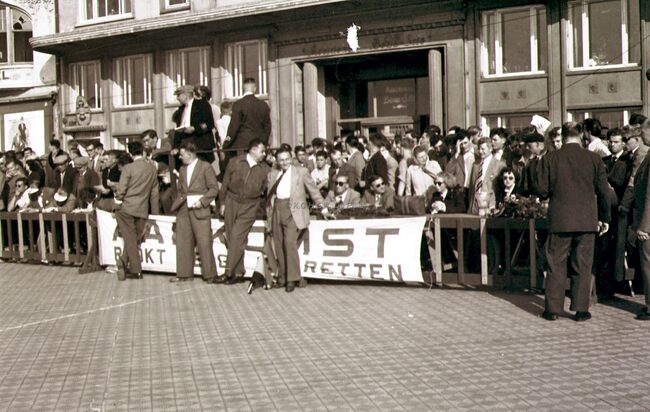 De renners zijn in aantocht ! De eindstreep van de 3e Grote Prijs der Kursaal voor wielrenners op de Albert I Promenade. De wedstrijd werd gewonnen door Omer BRAEKEVELT.