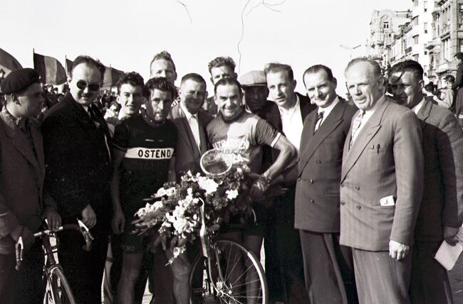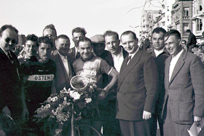 De winnaar van de 3e Grote Prijs der Kursaal 1954, Omer BRAEKEVELT, na de aankomst. Naast hem een wielrenner van Ostend Stadion Velo Club. Tweede van links Roger DE RAMEE, concessionnaris kursaal.