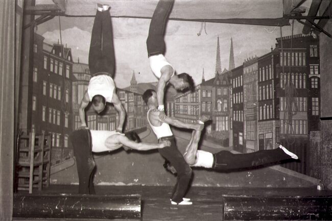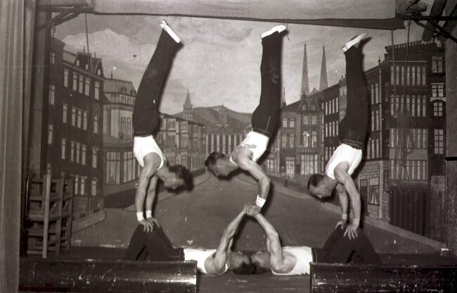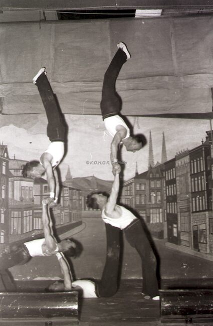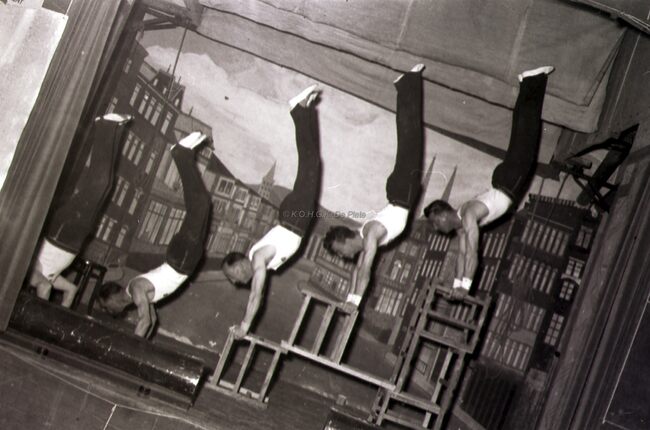 Leden van een turnvereniging tonen een staaltje van hun kunnen in een Bredens (?) theaterzaaltje.