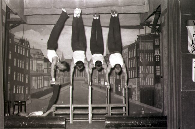 Een turnvereniging treedt op in een theaterzaaltje te Bredene (?).