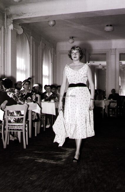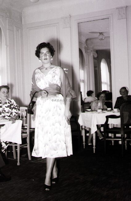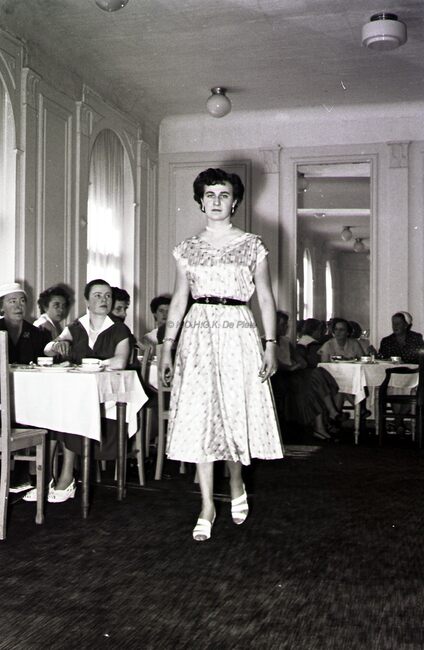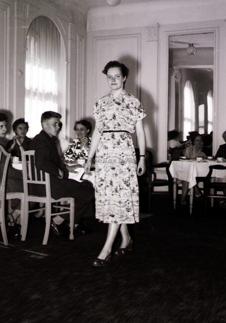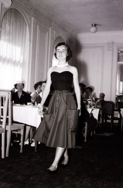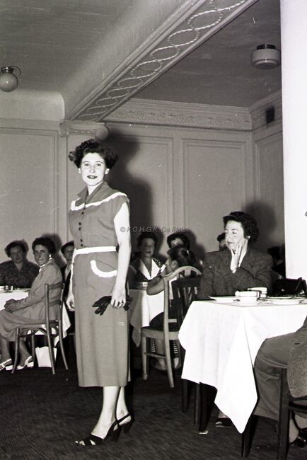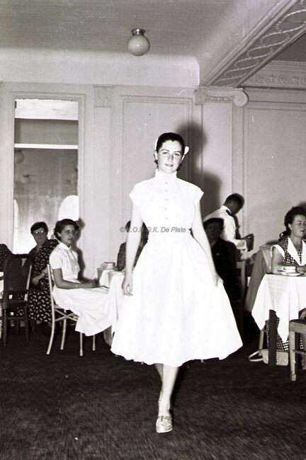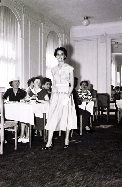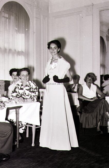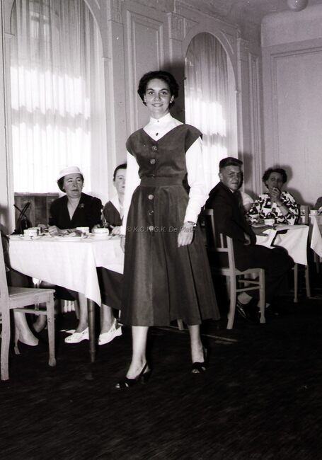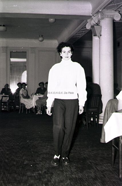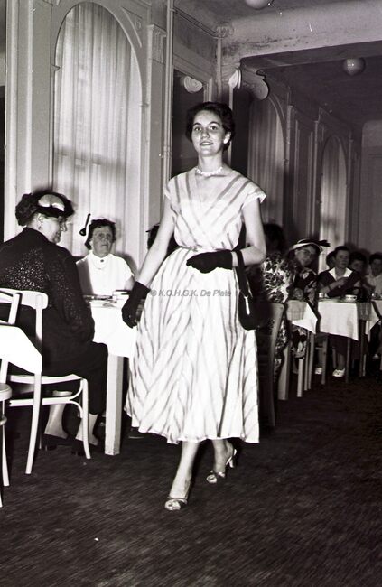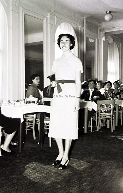 Foto : Modeshow "Snij- en Naaischool Hilda Ureel". Hôtel de la Couronne. 1954