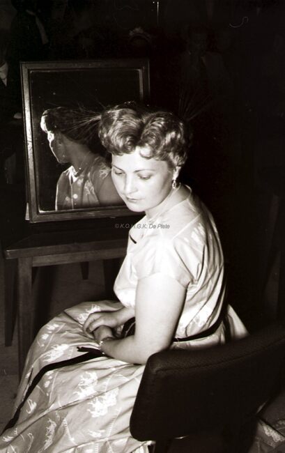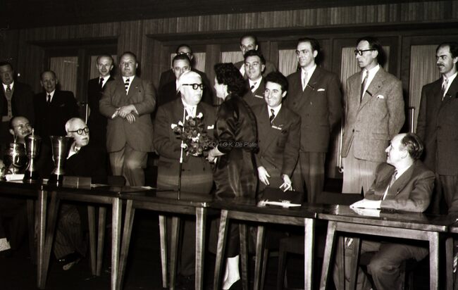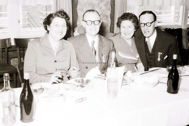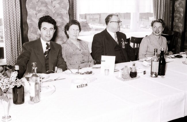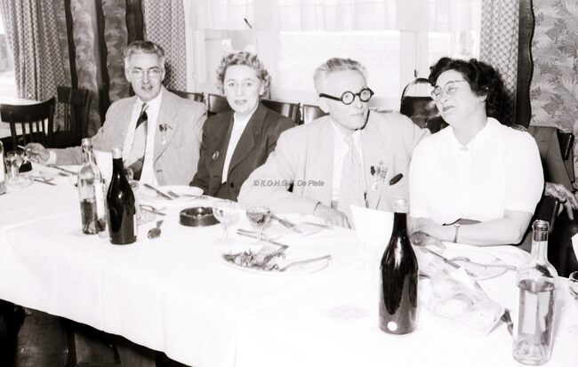 Deelnemers aan het banket van de kappers met hun echtgenotes. Links de heer en mevrouw BORGERS, kappers in de Vlaanderenstraat