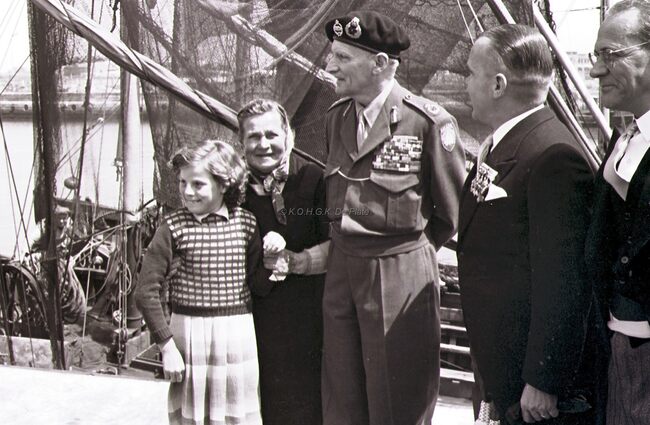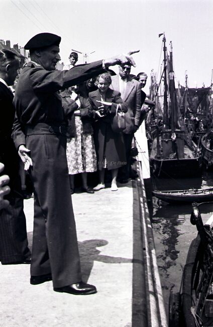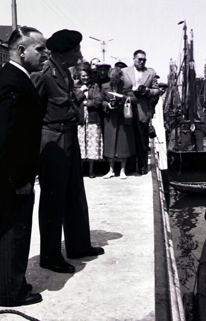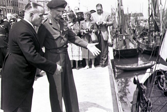 Veldmaarschalk MONTGOMERY met burgemeester Adolf VAN GLABBEKE op de Visserskaai nabij het Montgomerydok.