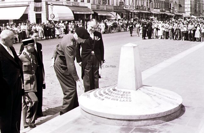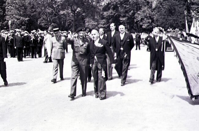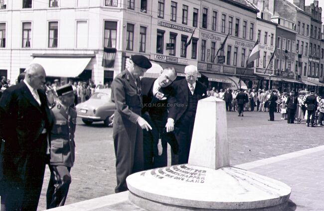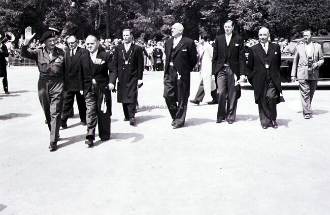 Het Canadaplein. Veldmaarschalk MONTGOMERY, burgemeester Adolf VAN GLABBEKE, achter hen schepenen Maurice QUAGHEBEUR, Jan PIERS en Kamiel DEHOUCK.