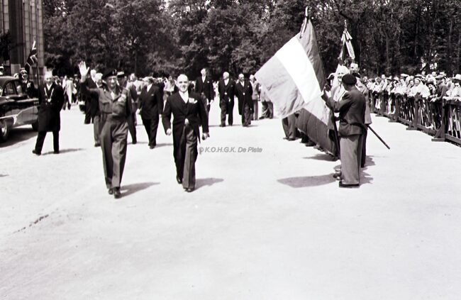 Veldmaarschalk MONTGOMERY en burgemeester Adolf VAN GLABBEKE op het Canadaplein. De vaderlandslievende verenigingen met hun vlaggen vormen een erehaag.