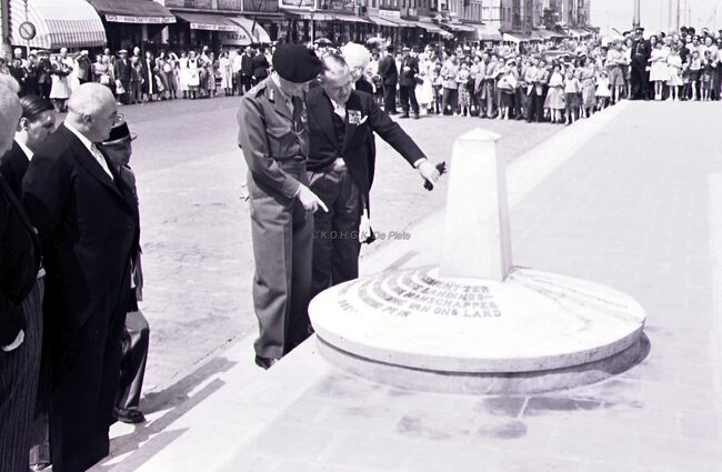 Veldmaarschalk MONTGOMERY en burgemeester Adolf VAN GLABBEKE op de Visserskaai bij het herdenkingszuiltje. Links, schepen Maurice QUAGHEBEUR