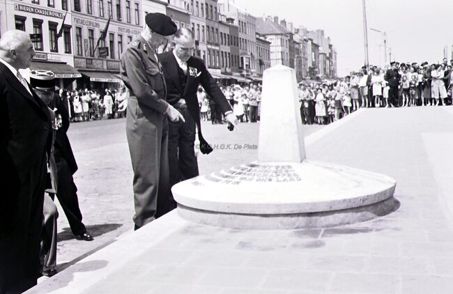 De Visserskaai ter hoogte van het Vissersplein. Veldmaarschalk MONTGOMERY bekijkt samen met burgemeester Adolf VAN GLABBEKE het zuiltje dat ter gelegenheid van zijn bezoek op 3 april 1948 aan onze stad geplaatst werd. …