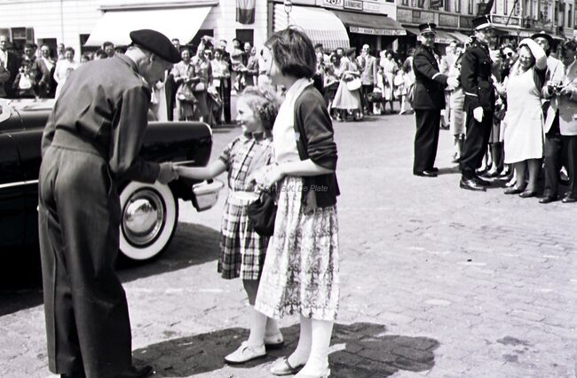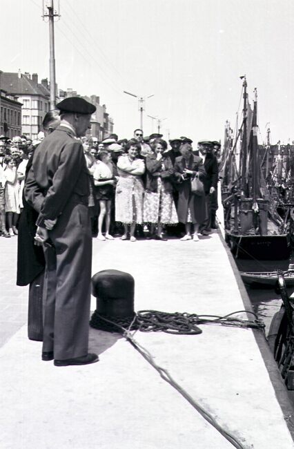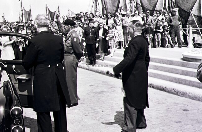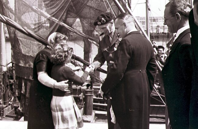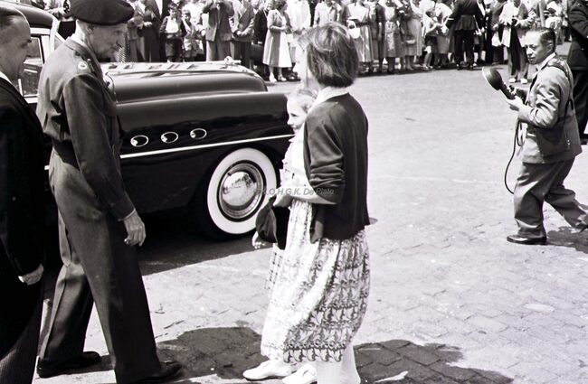 Inwoners van onze stad begroeten veldmaarschalk MONTGOMERY op de Visserskaai. Rechts burgemeester Adolf VAN GLABBEKE en schepen Frans VAN CAILLIE