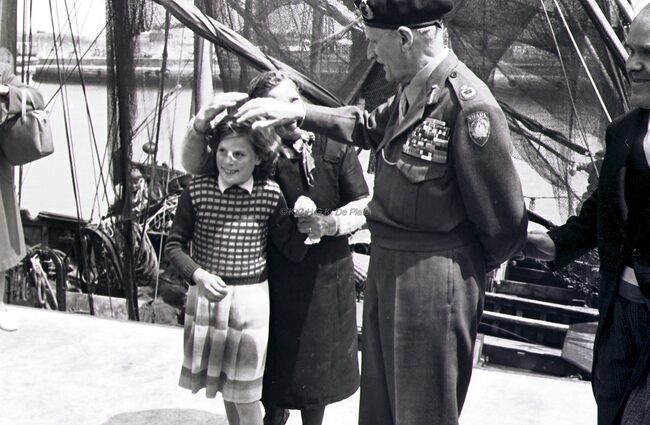 Twee Oostendse meisjes begroeten veldmaarschalk MONTGOMERY op de Visserskaai