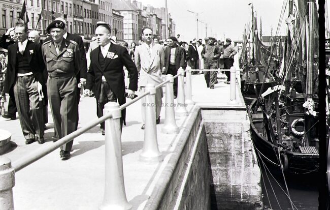 Veldmaarschalk MONTGOMERY, hier op de Visserskaai, bekijkt samen met burgemeester Adolf VAN GLABBEKE het herdenkingszuiltje opgericht naar aanleiding van zijn bezoek op 3 april 1948. Achter hem de schepen Jan PIERS en…