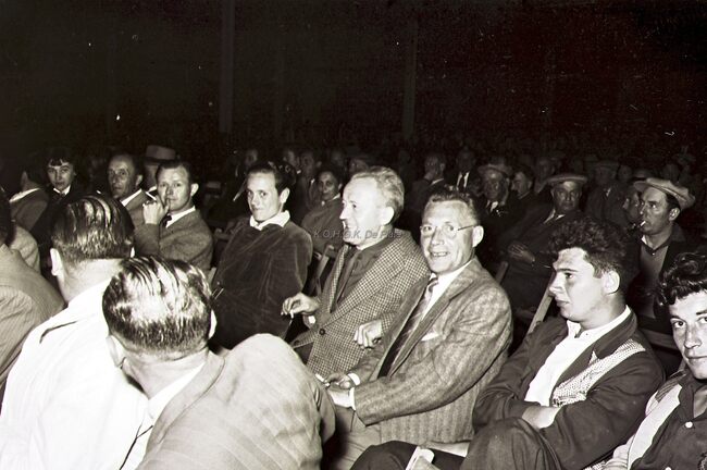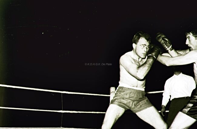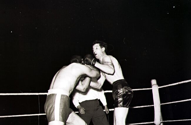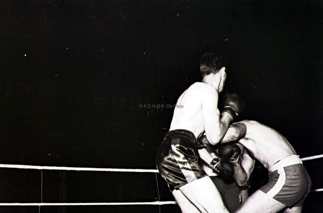 Kamp in de categorie halfzwaargewichten tussen de Oostendenaar Adrien Verburgh (links) en de Brusselaar Arthur Acha. Verburgh won op punten. Adrien Verburgh, 35 jaar oud, werd in 1965 Belgische kampioen zwaargewicht…