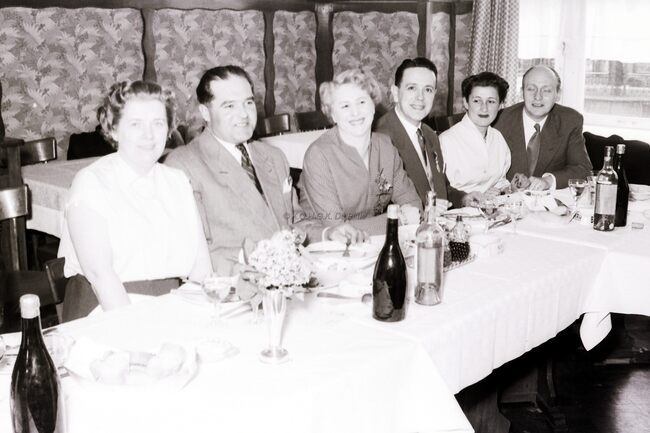Deelnemers aan het banket van de kappers heffen het glas. Links de heer en mevrouw BORGERS, kappers in de Vlaanderenstraat