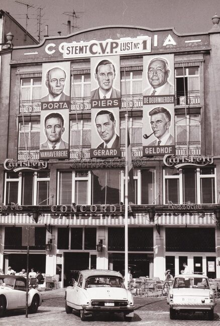 De "Concordia",lokaal van de Christelijke Volks Partij op het Wapenplein tijdens een kiesperiode.De kopstukken van de partij sieren (?) de gevel.