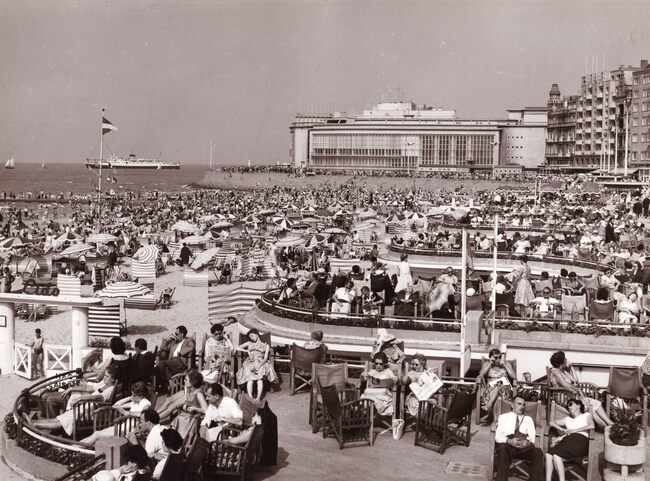 Formaat : 18 x 24 cm. - Het groot dtrand, vanaf de badinstallaties onder de Albert I-Promenade. We zien links, het Lido en op het einde de westgevel van het vierde Kursaal.