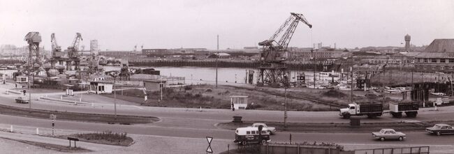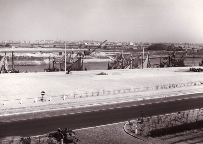 Formaat : 18 x 24cm. - Zicht op het Visserijdok van op het dak van de vismijn. Op de achtergrond de Vuurtorenwijk.