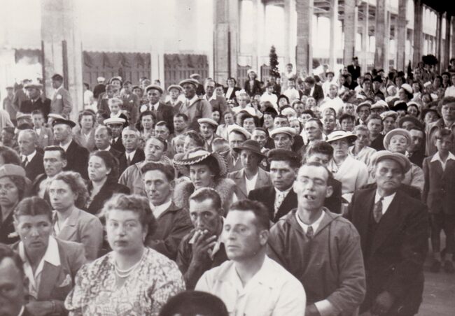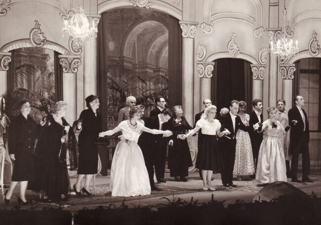 Een toneelgezelschap groet het publiek na afloop van het stuk in de Oostendse schouwburg (?).