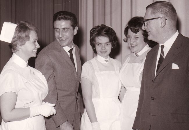 De Franse zanger Gilbert BECAUD in het kursaal met enkele Oostendse (?) schonen en een onbekende.