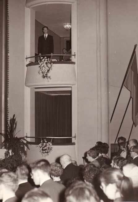 Formaat : 18 x 13 cm. - Koning Boudewijn in de koninklijke loge van de Koninklijke Schouwburg (Van Iseghemlaan). Ij woonde de slotvoorstelling bij van het Koninklijk Landjuweel.