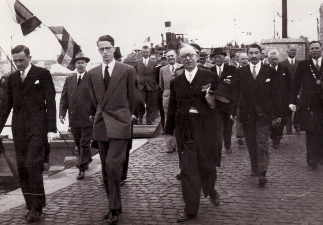 Koning Boudewijn geflankeerd door Pierre van Outryve d'Ydewalle, provinciegouverneur en burgemeester Henri Serruys, rechts, op weg naar de inhuldigingsplechtigheid van de Vismijn. Rechts achter de burgemeester,…