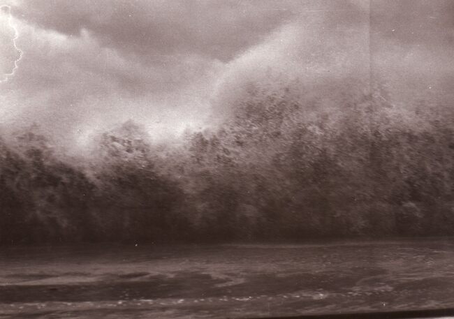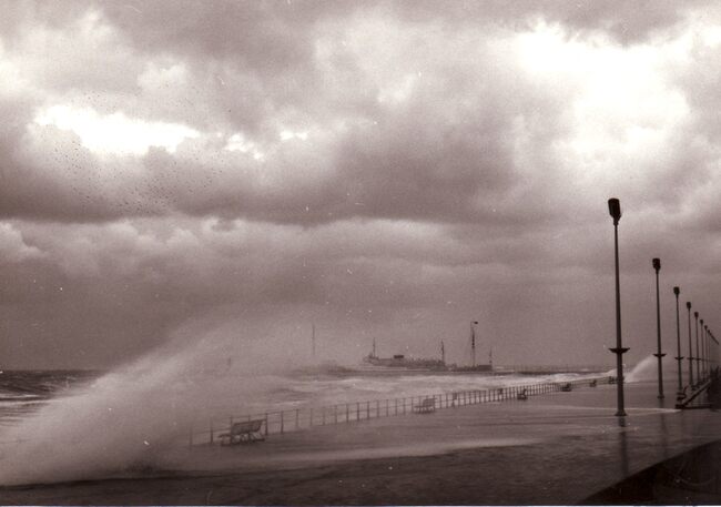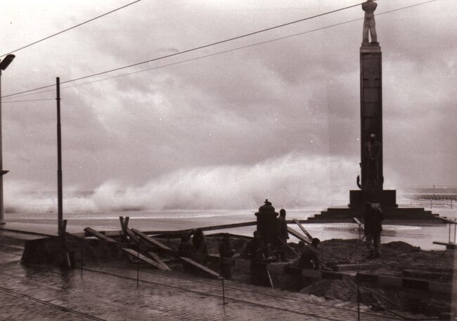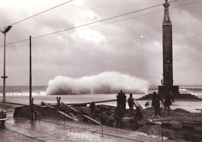 Het water slaat over aan het Zeeheldenplein bij stormachtig weer.Er zijn wegenwerken bezig.De (stads) tram reed hier toen nog voorbij (zie rails).