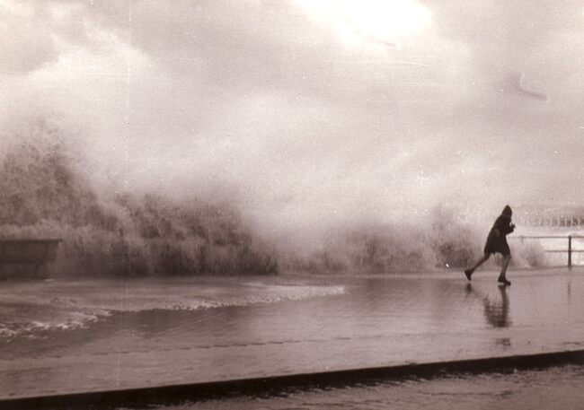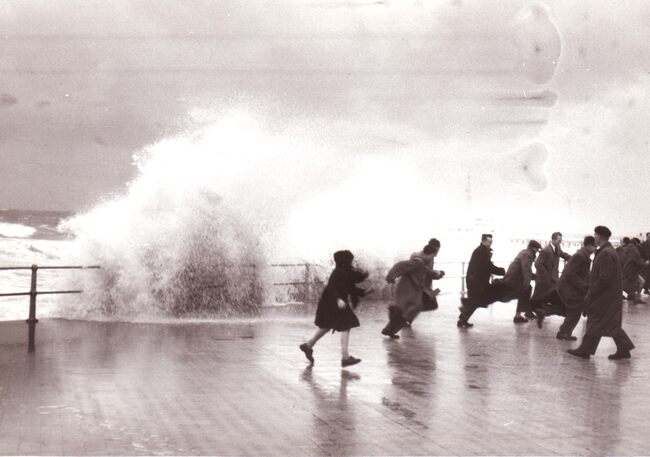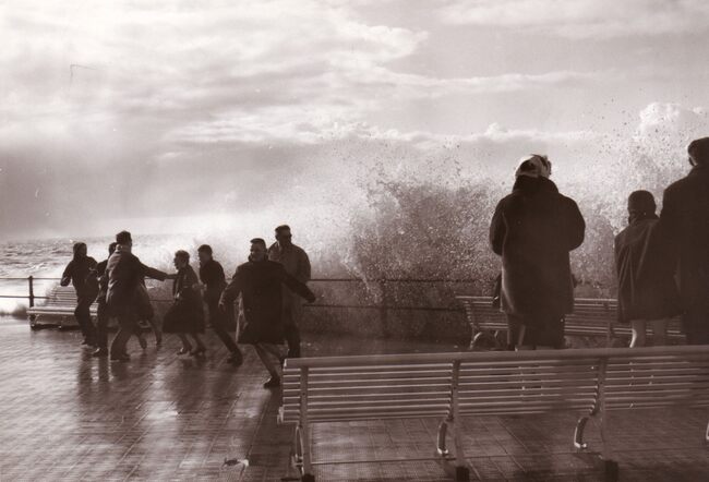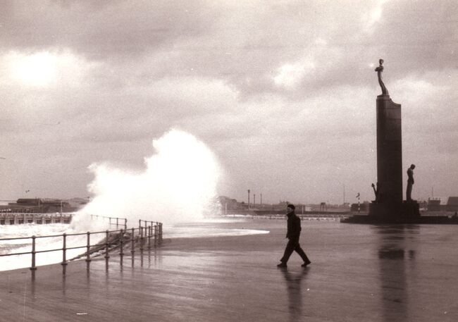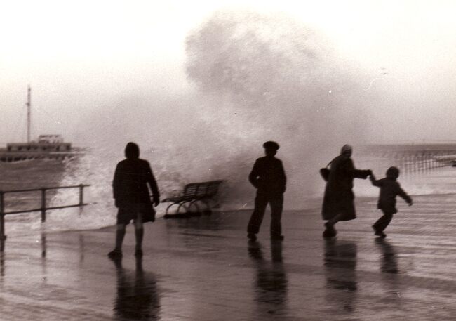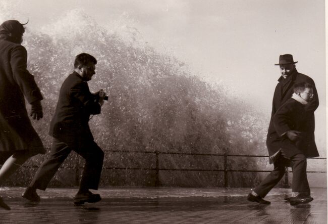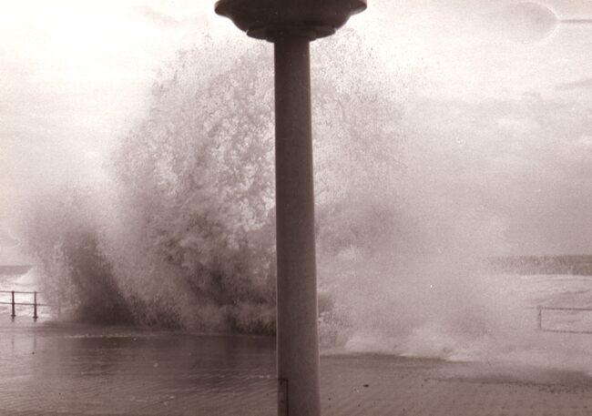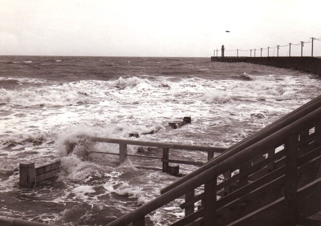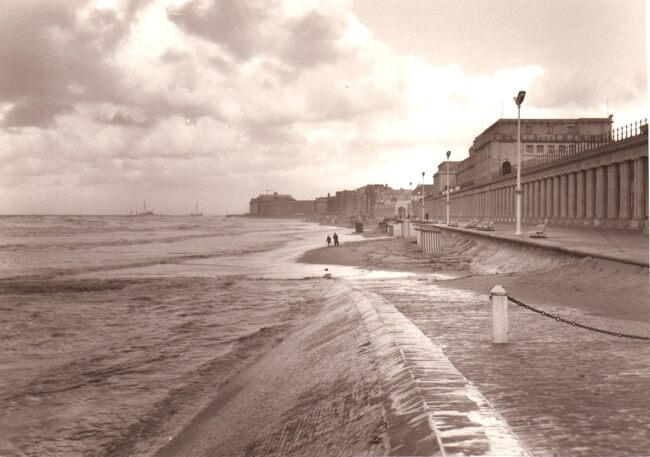Opspattend water aan de Albert I Promenade bij een flinke bries en hoog tij.Wandelaars genieten van dit nu helaas verdwenen schouwspel.
