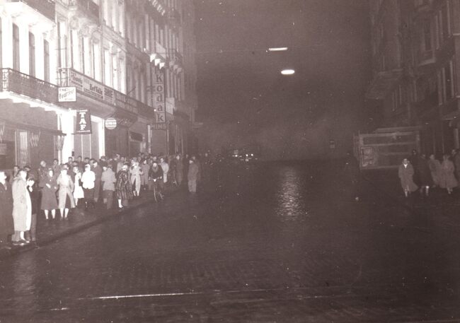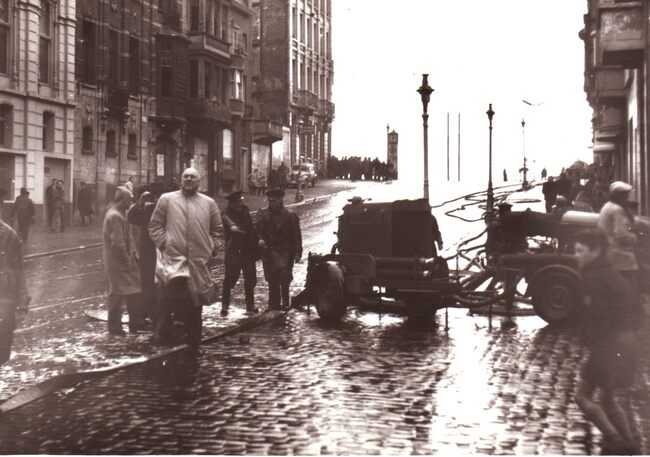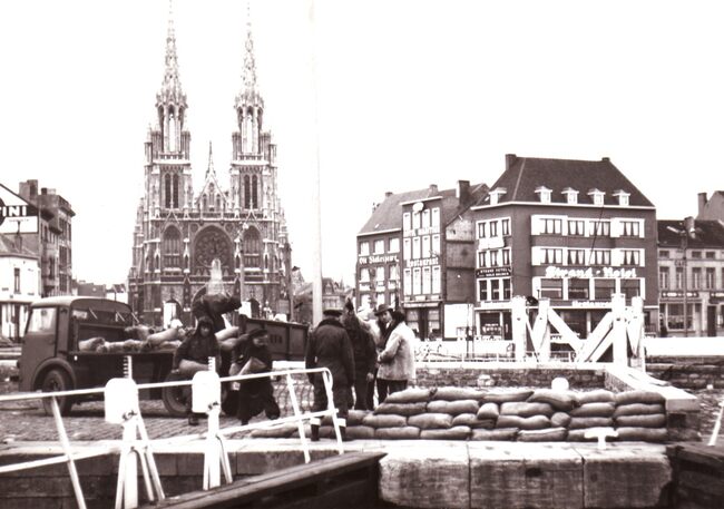 Stormweer,het overgeslagen water loopt de helling van de Vlaanderenramp af.Links de gekende fotowinkel Leurs.