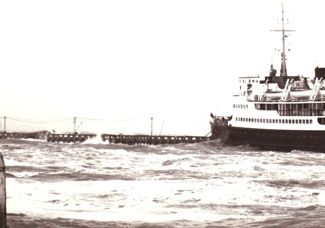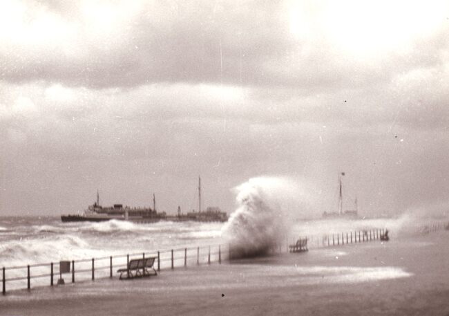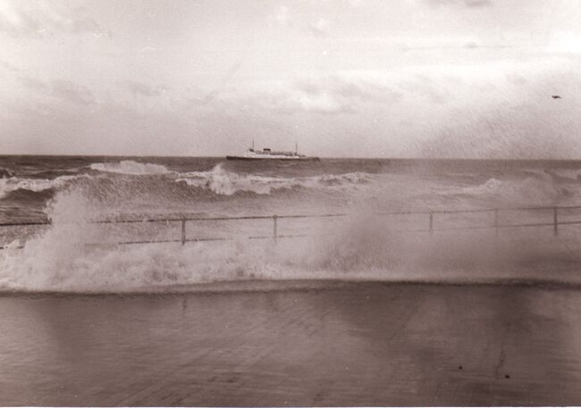 De ferry "Koningin Astrid" heeft het lastig in de havengeul bij stormweer,en heeft haar anker moeten laten vallen om te kunnen maneuvreren.