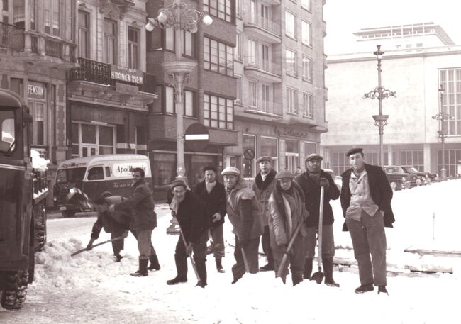 De mannen van de stedelijke reinigingsdienst worden ingezet bij het sneeuwruimen in de Leopold II laan.