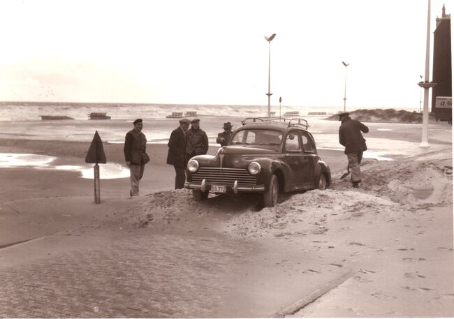 De Van Iseghemlaan,helling naar de zeedijk.Het overgeslagen water bij storm wordt weggepompt door de brandweer.Maurice QUAGHEBEUR,schepen en dd. burgemeester volgt de gebeurtenissen op de voet.