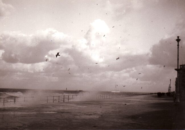 Meeuwen boven de Albert I Promenade bij stormweer.